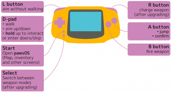 - D-pad: walk, aim up/down, hold up to interact or enter doors/ship