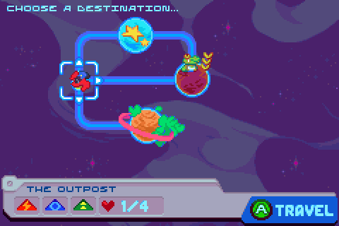Use the D-pad to select a planet. The interface will display which gate-routes are completed, and how many friends you've made on that planet.